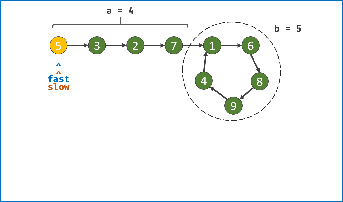 而目前 slow 指针走了 nb 步。因此,我们只要想办法让 slow 再走 a 步停下来,就可以到环的入口。